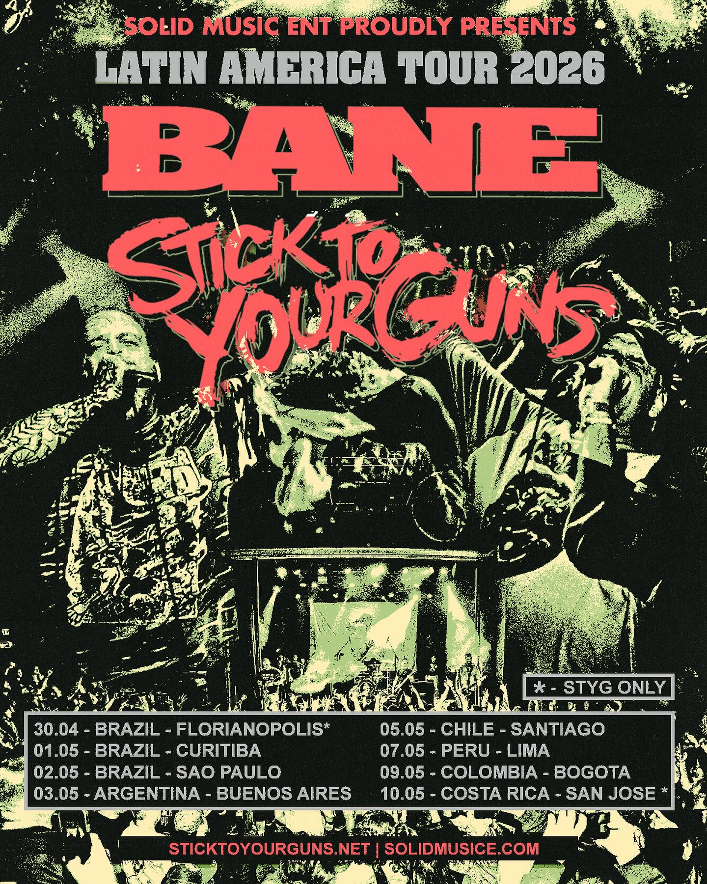 Entre abril e maio de 2026, Bane e Stick To Your Guns passam por seis países: Brasil, Argentina, Chile, Peru, Colômbia e Costa Rica. Uma oportunidade rara de ver duas referências mundiais lado a lado em noites que prometem ser inesquecíveis. A turnê é organizada pela Solid Music.